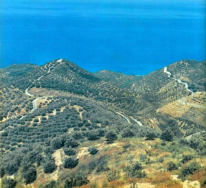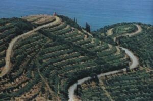 Rruga për në “Plazhin e Shpellave” ndjek kodrat poshtë si një rrugë gjarpëruese midis ullinjve.